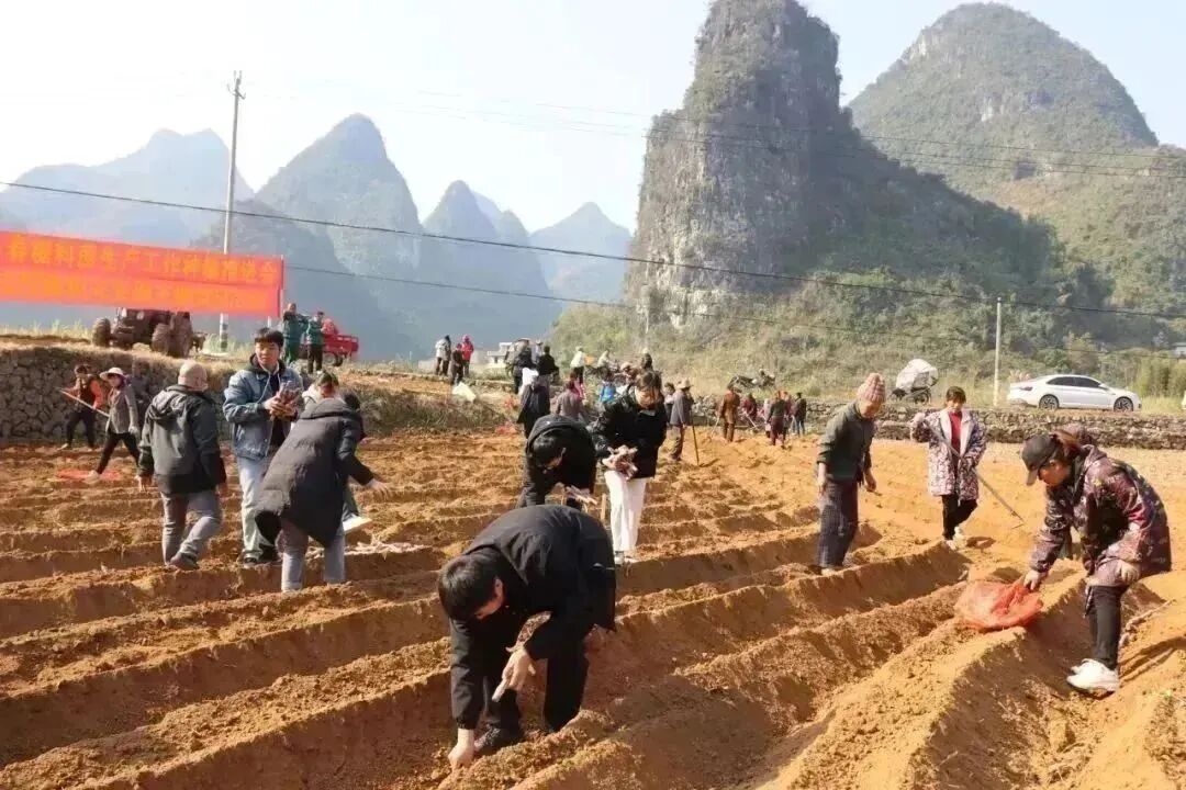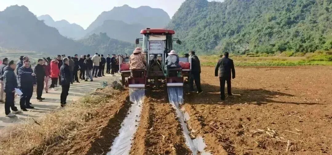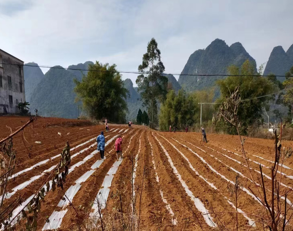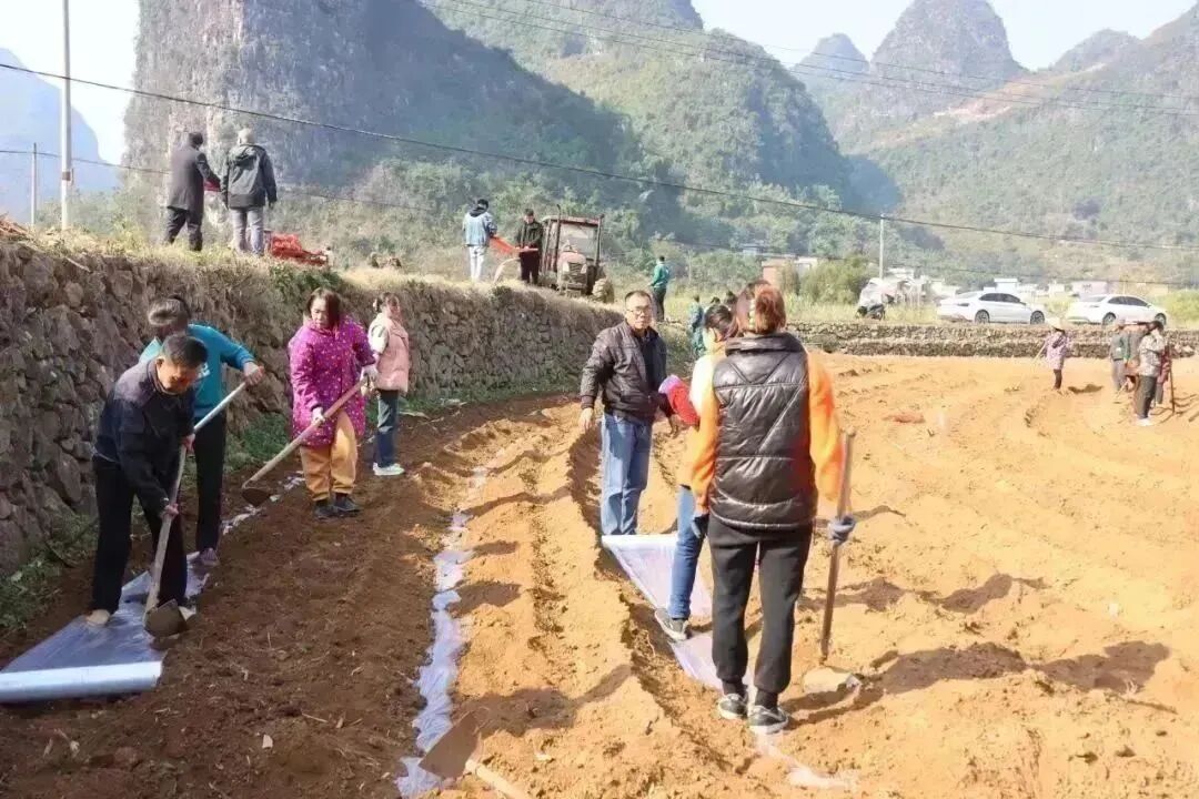 韦锦艳是村里的乡村振兴“十百千万”先锋示范户,也是甘蔗种植大户,走到韦锦艳承包的甘蔗地中,只见蔗农们正忙活着放苗、施肥、覆土、盖膜,一派繁忙景象。