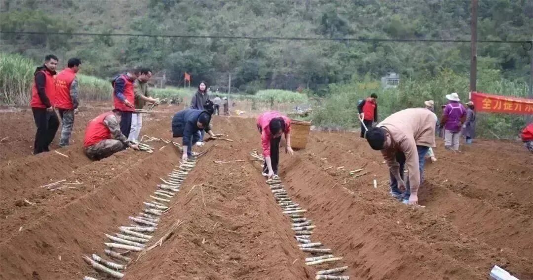 技术人员从种苗、肥料、地膜等方面进行现场教学,就如何提高单产进行技术培训,当天干群合力共帮助农户种植了2亩甘蔗。